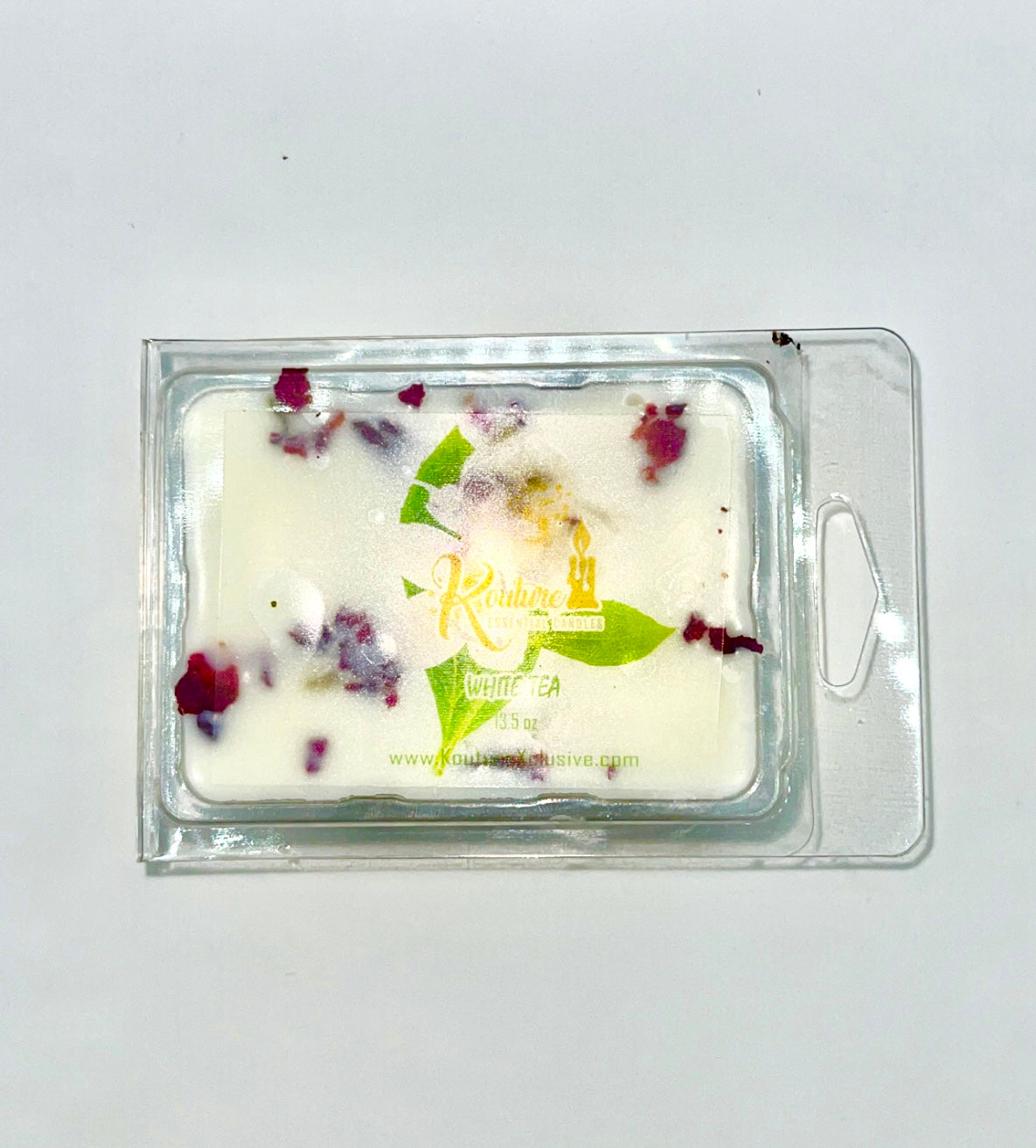 Our White Tea Wax Melts is a fresh ginger, jasmine, and white tea luxurious spa aroma. Our wax melts begins with a citrus relaxing essence that will fill any room. Kouture Essential Wax Melts are handcrafted and made with 100% all-natural soy wax.