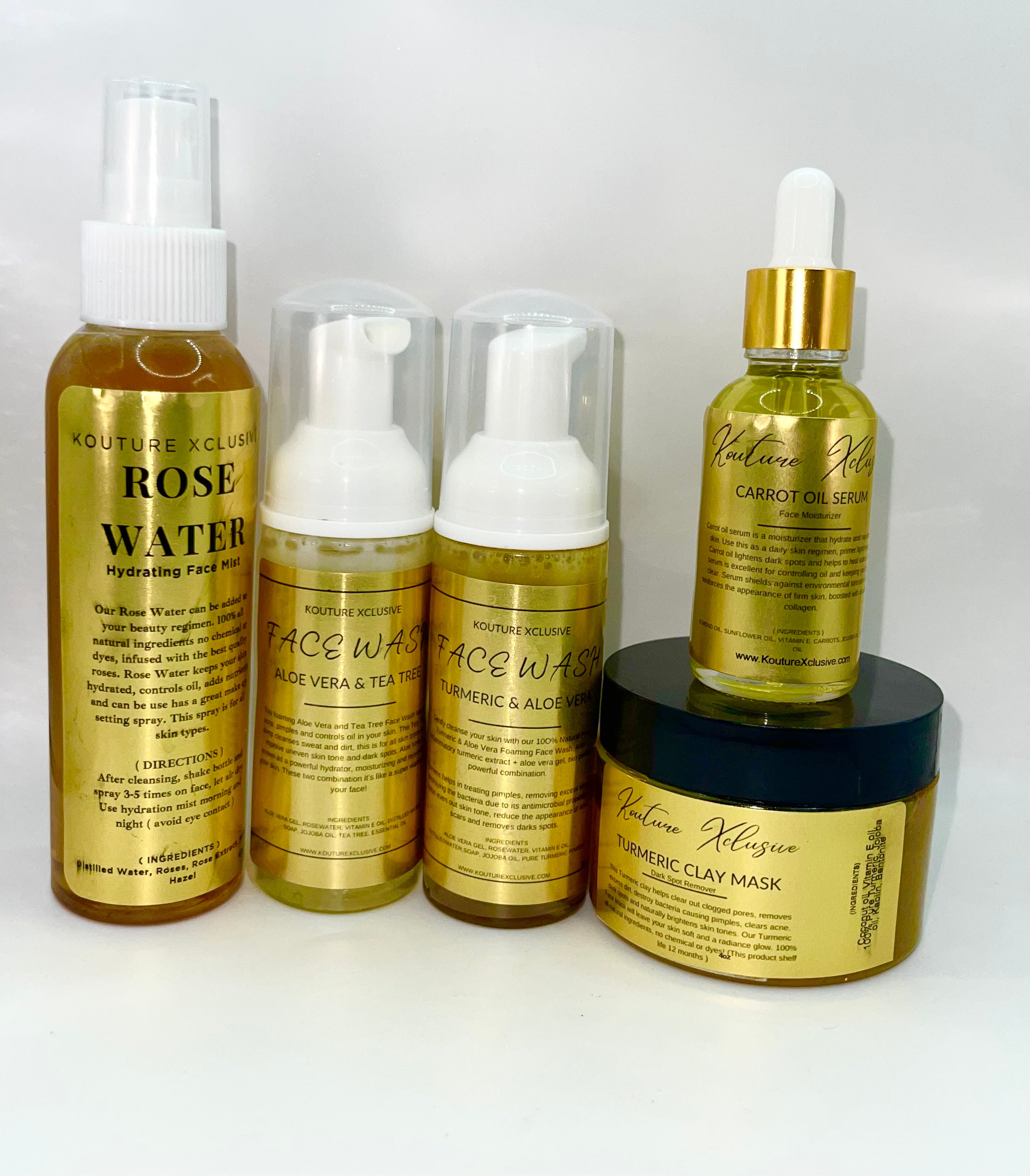 This powerful skin care set is perfect, you have two powerful facial cleansers, a hydration spray which is rosewater, you have your face moisturizer which is a carrot oil serum. This set would not be complete without our turmeric facial clay mask. ( Xclusive Cleansing Set is for people with medium to severe acne, dark spots, discoloration in skin, dry skin )